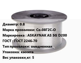 Проволока сварочная 0.8 Сталь: Св-08Г2С-О ASKAYNAK AS SG D200 ГОСТ: ГОСТ 2246-70 омедненная кассета 5