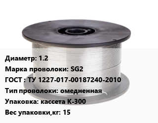 Проволока сварочная 1.2 Сталь: SG2 ГОСТ: ТУ 1227-017-00187240-2010 омедненная кассета К-300 15