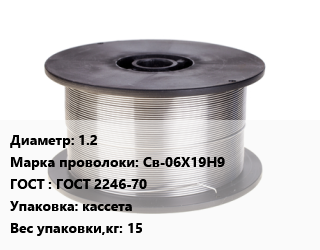 Проволока сварочная 1.2 Сталь: Св-06Х19Н9 ГОСТ: ГОСТ 2246-70 кассета 15