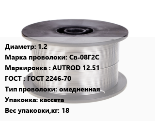 Проволока сварочная 1.2 Сталь: Св-08Г2С AUTROD 12.51 ГОСТ: ГОСТ 2246-70 омедненная кассета 18