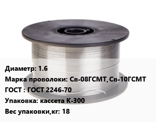 Проволока сварочная 1.6 Сталь: Св-08ГСМТ, Св-10ГСМТ ГОСТ: ГОСТ 2246-70 кассета К-300 18