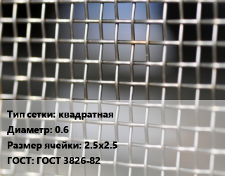 Сетка тканая квадратная d=0.6 Ячейка: 2.5х2.5 ГОСТ: ГОСТ 3826-82