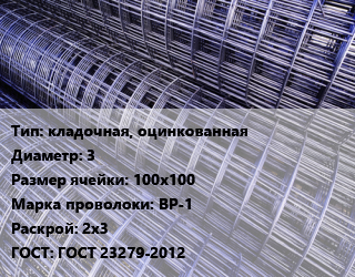 Сетка кладочная, оцинкованная d=3 Ячейка: 100х100 ВР-1 Раскрой: 2х3 ГОСТ: ГОСТ 23279-2012