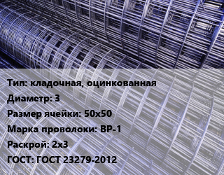 Сетка кладочная, оцинкованная d=3 Ячейка: 50х50 ВР-1 Раскрой: 2х3 ГОСТ: ГОСТ 23279-2012