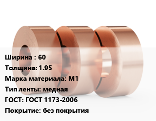 Лента медная 60х1.95 Марка: М1 медная ГОСТ: ГОСТ 1173-2006 без покрытия