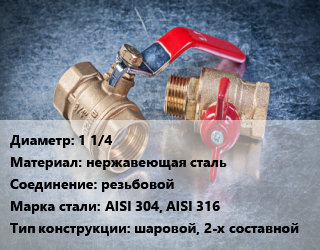 Кран металлический 1 1/4 нержавеющая сталь резьбовой Сталь: AISI 304, AISI 316 шаровой, 2-х составной