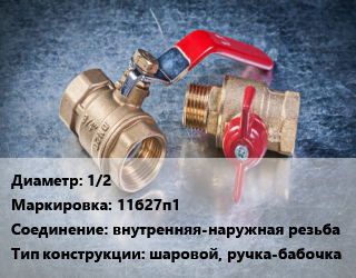 Кран металлический 1/2 11б27п1 внутренняя-наружная резьба шаровой, ручка-бабочка