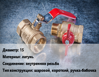 Кран металлический 15 латунь внутренняя резьба шаровой, короткий, ручка-бабочка
