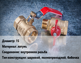 Кран металлический 15 латунь внутренняя резьба шаровой, полнопроходной, бабочка