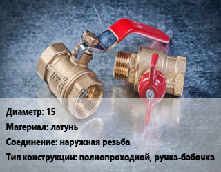 Кран металлический 15 латунь наружная резьба полнопроходной, ручка-бабочка