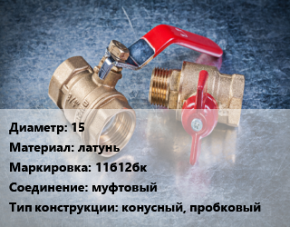 Кран металлический 15 латунь 11б12бк муфтовый конусный, пробковый