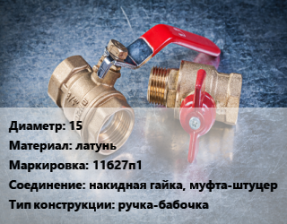 Кран металлический 15 латунь 11б27п1 накидная гайка, муфта-штуцер ручка-бабочка