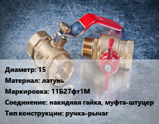 Кран металлический 15 латунь 11Б27фт1М накидная гайка, муфта-штуцер ручка-рычаг