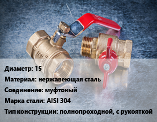 Кран металлический 15 нержавеющая сталь муфтовый Сталь: AISI 304 полнопроходной, с рукояткой