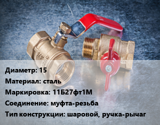 Кран металлический 15 сталь 11Б27фт1М муфта-резьба шаровой, ручка-рычаг
