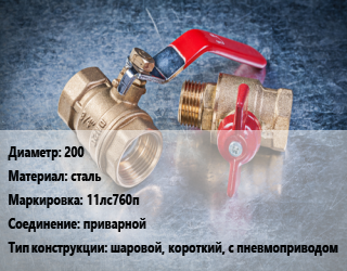 Кран металлический 200 сталь 11лс760п приварной шаровой, короткий, с пневмоприводом
