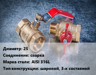 Кран металлический 25 сварка Сталь: AISI 316L шаровой, 3-х составной