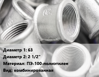 Муфта 63х2 1/2" ПЭ-100-полиэтилен комбинированная, внутренняя резьба,наружная резьба, шт цена от 190.17 сом / шт, где купить, условия доставки в Бишкеке и Чуйской области
