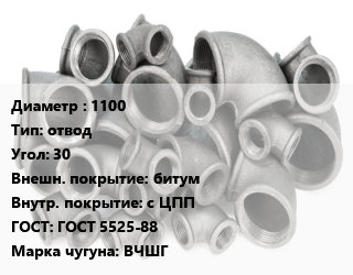 Отвод чугунный 1100 отвод Угол:30 битум *с ЦПП ГОСТ 5525-88 Марка: ВЧШГ