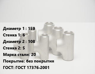Тройник стальной 159х6 -108х5 Сталь: 20 без покрытия ГОСТ: ГОСТ 17376-2001