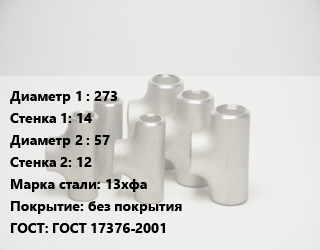 Тройник стальной 273х14 -57х12 Сталь: 13хфа без покрытия ГОСТ: ГОСТ 17376-2001