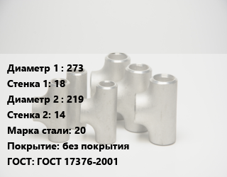 Тройник стальной 273х18 -219х14 Сталь: 20 без покрытия ГОСТ: ГОСТ 17376-2001