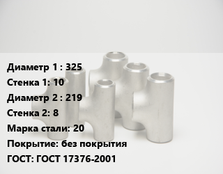 Тройник стальной 325х10 -219х8 Сталь: 20 без покрытия ГОСТ: ГОСТ 17376-2001