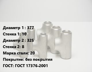 Тройник стальной 377х10 -325х8 Сталь: 20 без покрытия ГОСТ: ГОСТ 17376-2001