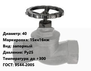 Вентиль чугунный - клапан запорный 40 15кч16нж запорный Ру25 до +300 9544-2005