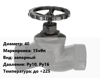 Вентиль чугунный - клапан запорный 40 15ч9п запорный Ру10, Ру16 до +225