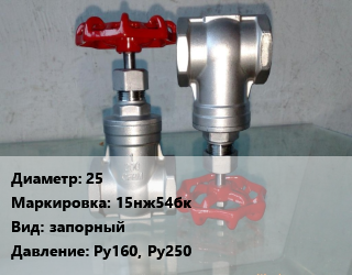 Вентиль нержавеющий - клапан запорный 25 15нж54бк запорный P=Ру160, Ру250