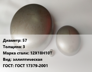Заглушка нержавеющая 57 s=3 Сталь: 12Х18Н10Т эллиптическая ГОСТ: ГОСТ 17379-2001